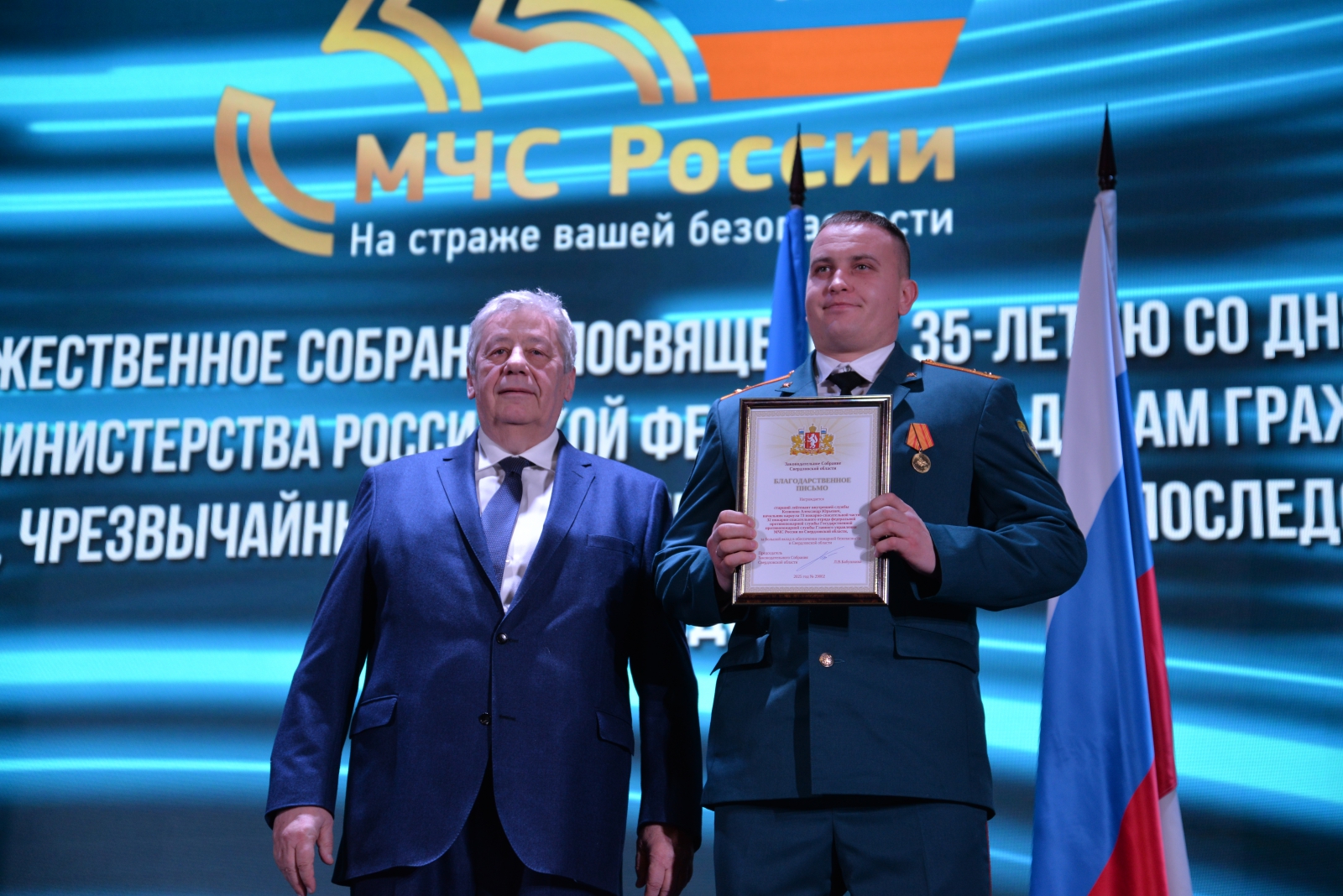 Полномочный представитель Президента России Артем Жога и первый заместитель председателя Законодательного Собрания Аркадий Чернецкий приняли участие в торжественном собрании коллектива Главного управления МЧС по Свердловской области, посвящённом 35-летию со дня образования Министерства Российской Федерации по делам гражданской обороны, чрезвычайным ситуациям и ликвидации последствий стихийных бедствий.