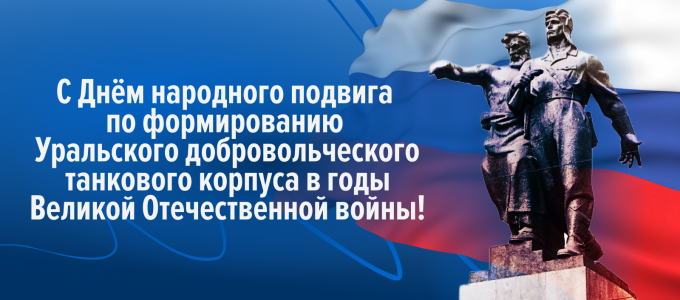 Дорогие земляки! Поздравляю с Днём народного подвига по формированию Уральского добровольческого танкового корпуса в годы Великой Отечественной войны! В этот знаменательный день желаю вам здоровья, счастья, благополучия, больших успехов в работе и службе на благо нашей великой Родины!