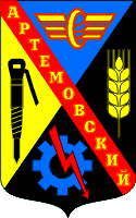 «Герб города состоит из красного щита размером 1,5 х 2 м с изображением на нем, в верхнем левом углу голубого экрана, эмблемы железнодорожного транспорта, золотого колоса, отбойного молотка, голубой шестеренки, пересеченной молнией. По диагонали щита надпись город “Артёмовский”».