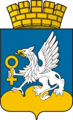 ![]() В лазоревом поле на золотой трехверхой горе серебряный идущий грифон с золотыми клювом и глазами, держащий в правой передней лапе золотое “зеркало Венеры”. |