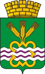 ![]() В зеленом поле золотой полый камень, положенный угловатыми выступами в крест, а округлыми косвенно; камень увенчан тремя головками колосьев того же металла и переплетен с тройным серебряным пониженным поясом, разделенным пурпуром. |