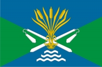 ![]() Полотнище, состоящее из голубой полосы вдоль верхнего края в 1/4 полотнища и основной части, разделенной по даигоналям на четыре части, равные по площади: вверху и внизу - голубые (без выделения границы с голубой полосой), по сторонам - зеленые; посередине полотнища желтым цветом воспроизведены стебли рогоза и под ними белым цветом - стилизованные волны. Оборотная сторона зеркально воспроизводит лицевую.