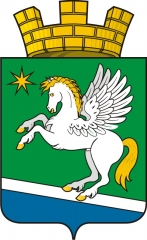 ![]() В зеленом поле на лазоревой косвенной, завершенной серебром, оконечности - восстающий серебряный крылатый конь с золотыми глазами, языком, гривой, хвостом и копытами, сопровождаемый справа вверху семилучевой звездой того же металла. Щит увенчан короной установленного образца. |