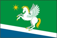 ![]() Прямоугольное полотнище с отношением ширины к длине 2:3, состоящее из трех неравных частей: большей зеленой, белой в виде нисходящей полосы шириною в 1/8 от ширины полотнища и синей в виде треугольника - вдоль нижнего края в 1/4 от ширины полотнища. По центру полотнища помещено белое с желтым изображение крылатого коня с желтой семилучевой звездой. Оборотная сторона зеркально воспроизводит лицевую.