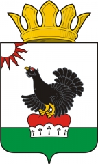 ![]() В серебряном щите с зеленой оконечностью – черный с золотыми клювом и лапами и червлеными бровями токующий глухарь на червленой с горностаевой опушкой и без дужек княжеской шапке, положенной поверх границы оконечности; в правом верхнем углу возникает безант в цвет поля в червленом солнечном сиянии, к которому и обращен глухарь. Щит увенчан короной установленного образца. |