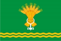 ![]() Зеленое полотнище с воспроизведением фигур герба района в желто-золотистом и белом цвете.