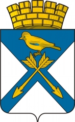 ![]() В серебряном поле лазоревый полый вверху косвенный крест, обремененный золотыми обращенными вниз стрелами накрест и над ними таковой же сидящей сойкой с лазоревыми плечиками и глазами. |