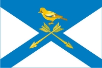 ![]() Прямоугольное полотнище с соотношением сторон 2:3 на котором помещен синий полый вверху косой крест с шириной концов в 1/5 от ширины полотнища по центру которого изображены фигуры районного герба: сойка, сидящая на скрещенных стрелах, выполненные желтым и синим цветами.